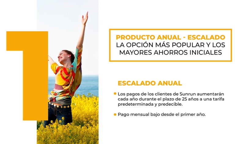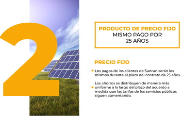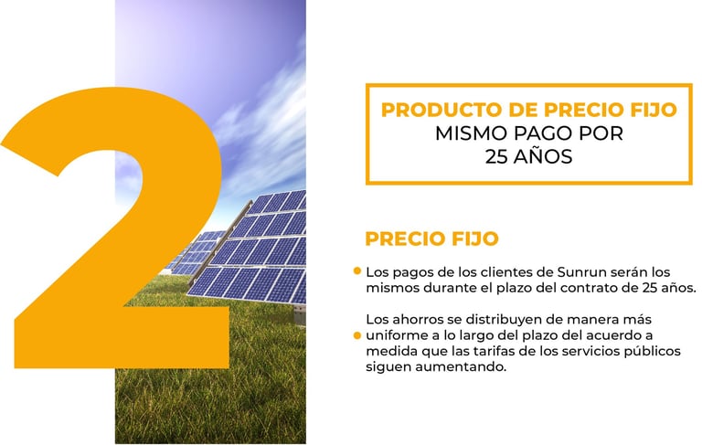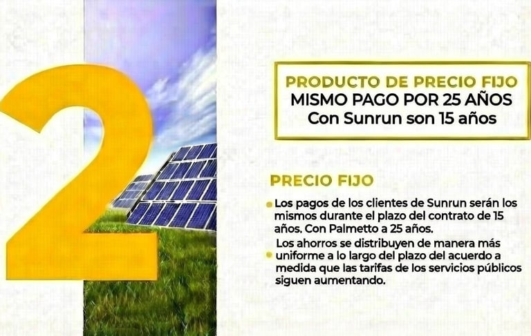 Los clientes pagan una cantidad fija cada mes durante el término del contrato (típicamente 10-25 años), sin ajustes anuales ni sorpresas, lo que garantiza presupuestos predecibles y ahorros inmediatos versus facturas variables de la red eléctrica. No requiere pago inicial hasta después de la medición neta, y cubre equipo, instalación y mantenimiento con garantía de 15 años.